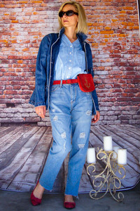 Anna wears Sam Edelman ripped jeans, Bill Blass vintage denim shirt and denim jacket, Sonia Rykiel red vintage suede belt purse, Nine West maroon suede ballerinas, and GFF sunglasses.
